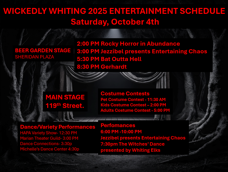 Get a spooky warm-up the weekend before the festival at our Haunted Hayride through Whihala Lakefront Trail. Rides run every 20 minutes from 6pm-10:30pm on Friday and Saturday, Sep. 26th and 27th. $5 Tickets can be purchased in advance at the Whiting-Robertsdale Chamber of Commerce (1417 119th St. Whiting, IN). Tickets can also be purchased during the event at the park *(CASH ONLY). Call 219-659-0292 for more information.